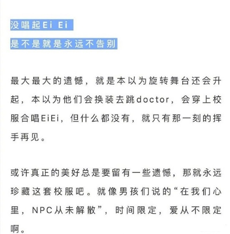 對此,愛奇藝發文回應「NPC演唱沒唱Ei Ei」,表示:「或許真正的美好總是要留有一些遺憾,那就永遠珍藏這套校服吧。就像男孩們說的“在我們心裡,NPC從未解散”,時間限定,愛從不限定。」