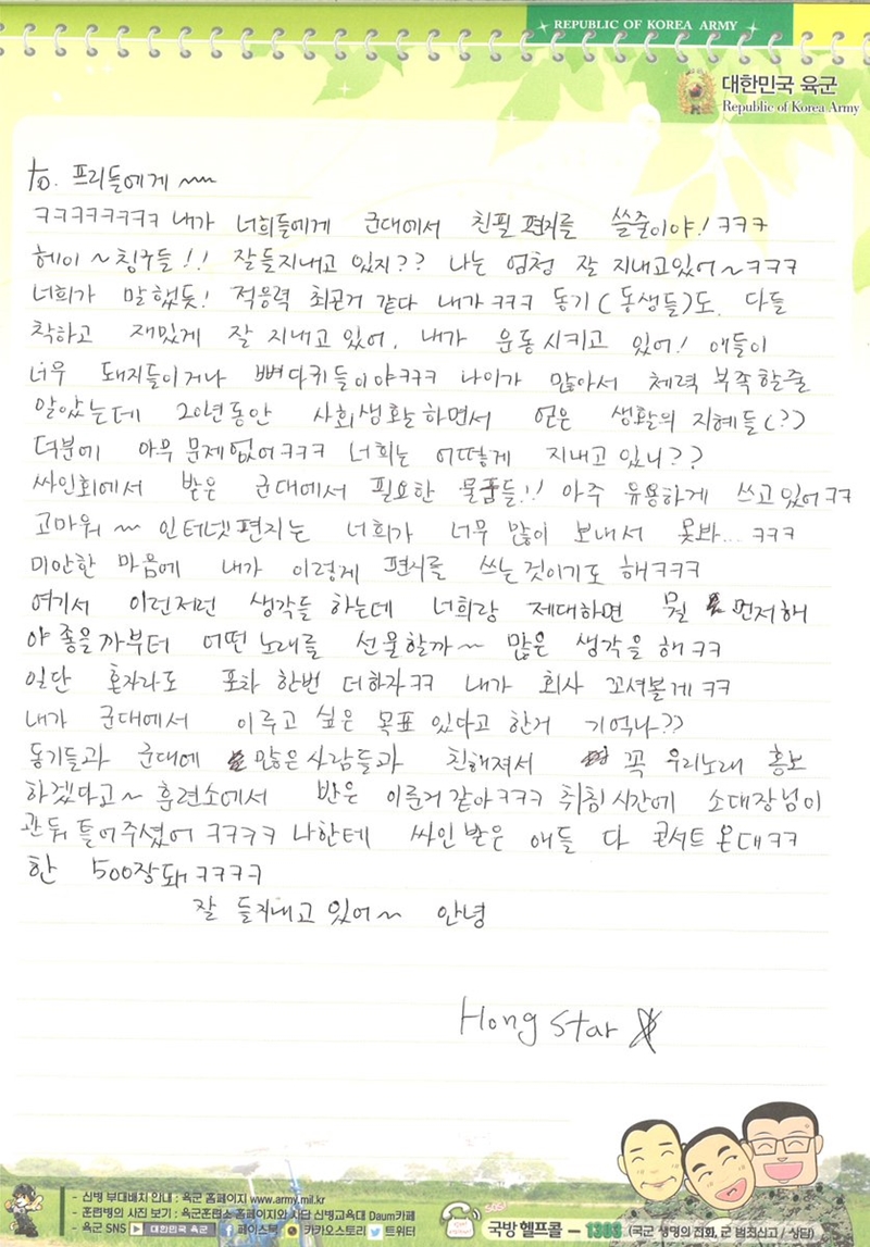 kkkkkkk我沒想到我居然會在軍隊給你們寫手寫信!kkk hey 朋友們!你們過的好嗎?我過的很好kk 就像你們說的,我的適應能力真的是最棒了。同期(弟弟們)也是,大家都很善良,所以過的很愉快。我在運動呢!孩子們要麼像豬一樣胖要麼就瘦的只有骨頭kkk,我以為年紀大了會體力不足,多虧了20多年來生活的智慧才沒有問題kkk,你們過的如何??在簽售會上收到的在軍隊必需的東西都很有用,我好好用著呢kk~謝謝!電子信因為你們寄太多了我看不了kkk~因為抱歉我才這麼寫手寫信的kkk~