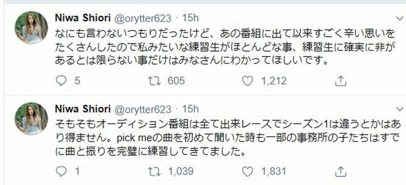 不過,Niwa表示一切都是製作組和經紀公司在背後的勾搭,而參賽的練習生們也只是傀儡一樣,毫無知情的狀況下進行比賽,卻被製作組和公司操控了。她補充道:「已透過節目出道的孩子們也是經歷過相同的辛苦,練習生們是無辜的。」