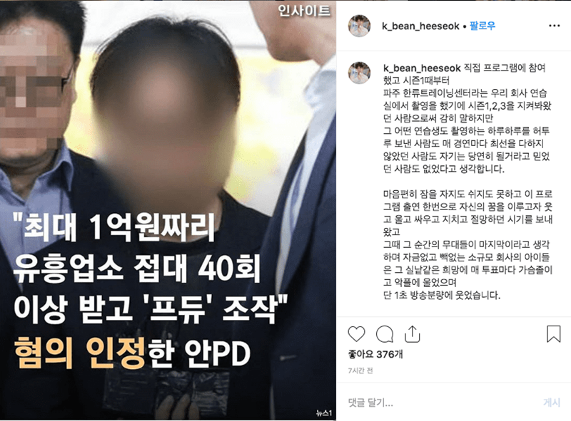 不過,隨著造假風波的消息越燒越烈,如今安俊英已承認操作排名和投票結果,朴熙石坦言曾參與拍攝的其他PD、FD和編劇們會被視為「壞人」。他表示,每一位工作人員都是很認真工作的,大家是為節目而做好本份。最後,無論是對練習生、歌手或工作人員,朴熙石希望不再會發生類似的事情。