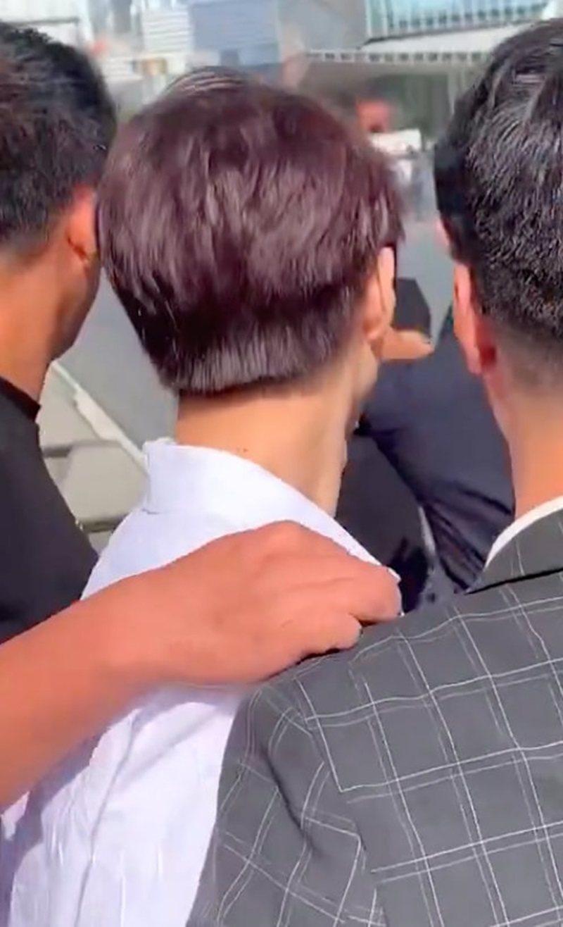 這位陌生的黑衣男子突然擠進人群,趁著王俊凱上車前,把手硬搭在王俊凱的肩膀上。王俊凱下意識甩開該男子的手,表情像是受到了驚嚇,上車前生氣的怒瞪對方。