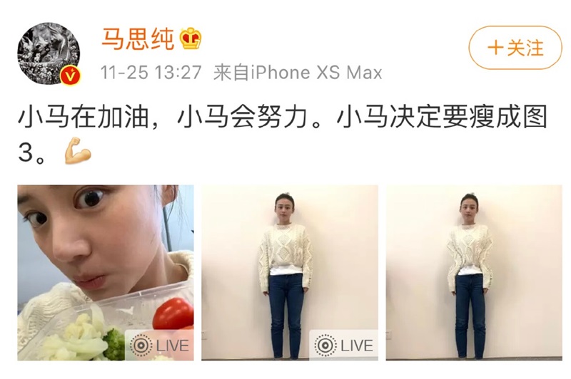 不久後,馬思純在微博更新了三張照片,並留言:「小馬在努力,小馬會努力。小馬決定要瘦成圖3。」她曬出一張捧著減肥必吃的燙青菜和小番茄自拍照,還將自己的身材用修圖軟件P得很誇張,表示自己要瘦成像P圖一樣。