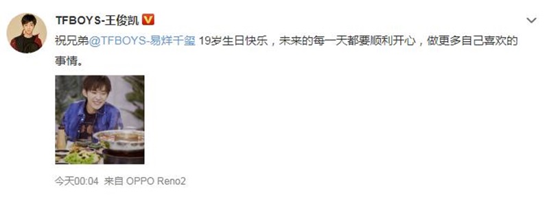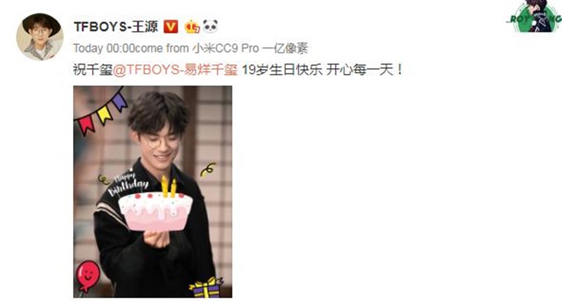TFBOYS團魂炸裂!王俊凱、王源準點為易烊千璽慶祝19歲生日! 千璽生日快樂!! 星聞 By 小小迷妹 Last updated Nov 28, 2019 Share 11月28日是什麼大日子?是的!就是易烊千璽的生日啦!許多粉絲都在28日零時,給壽星易烊千璽在微博送上生日祝福。當然,作為好兄弟的王俊凱和王源也不例外! 王俊凱和王源都準時在微博發文,給易烊千璽慶生。王俊凱分享了一張易烊千璽在吃火鍋的照片,並留言:「祝兄弟19歲生日快樂,未來的每一天都要順利開心,做更多自己喜歡的事情。」 王源則自製了一張生日慶生圖,寫道:「祝千璽19歲生日快樂 開心每一天!」 TFBOYS果然團魂滿滿啊!小編也祝千璽19歲生日快樂,每天都開開心心~ 圖來源:微博 TFBOYS易烊千璽王俊凱王源 Share