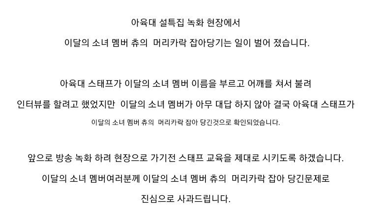 後來,MBC發表立場,承認工作人員有扯CHUU的頭髮,並解釋了事情的經過,同時也向各方道歉,並承諾會對員工進行徹底教育,不會在重犯相同錯誤。根據MBC的解釋,當時工作人員是有拍了CHUU的肩膀,但對方並沒有反應,才會做出粗暴的行為。只不過,若看視頻的話,似乎沒有發現工作人員拍肩膀,而是直接走上前就扯頭髮了啊?