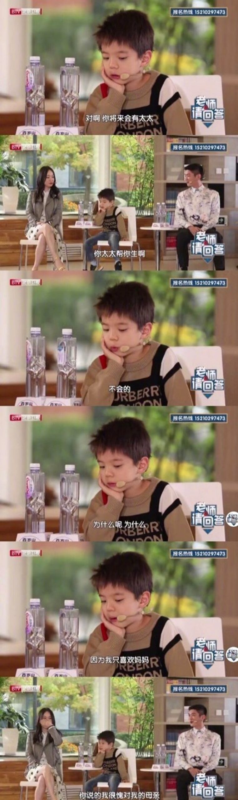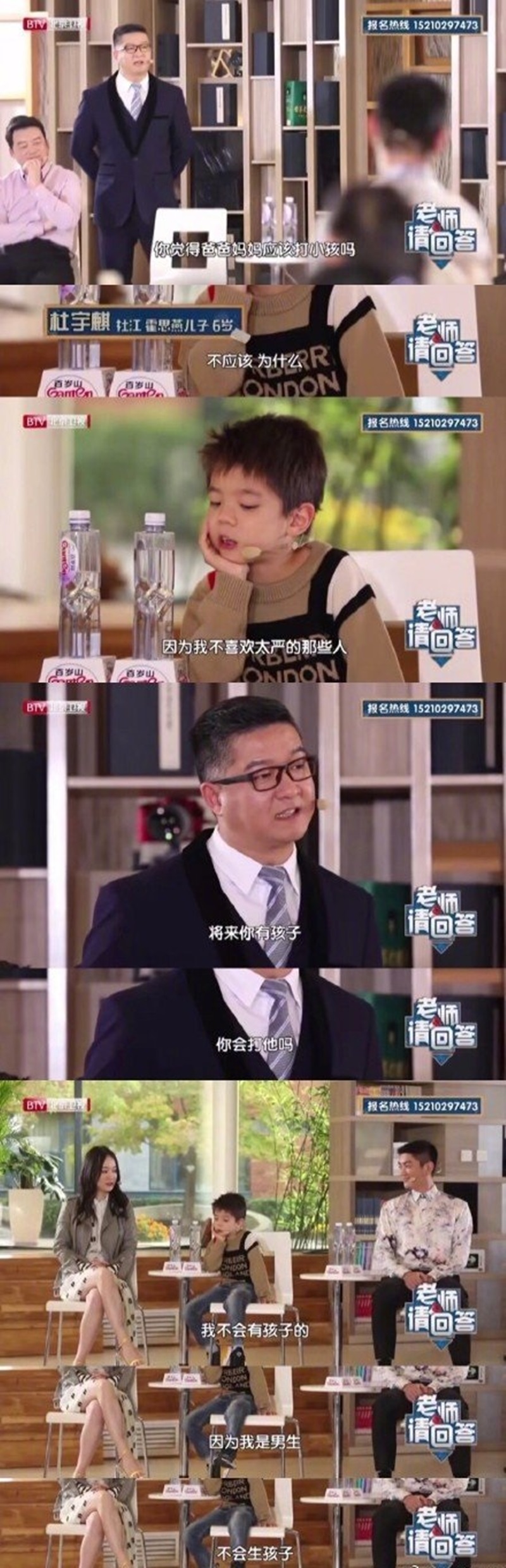 近日,杜江和霍思燕帶著嗯哼參加了《老師請回答》這檔節目,嗯哼的發言再次令觀眾大笑,大家都笑言金句大王嗯哼又上線啦!在被問到爸爸媽媽應不應該打小孩時,嗯哼搖頭說,「因為我不喜歡太嚴(嚴厲)的那些人。」主持人接著問如果以後有孩子會打他嗎?嗯哼一臉淡定的回答:「我不會有孩子的,因為我是男生,不會生孩子。」此話一出,身邊的爸媽都笑慘了。