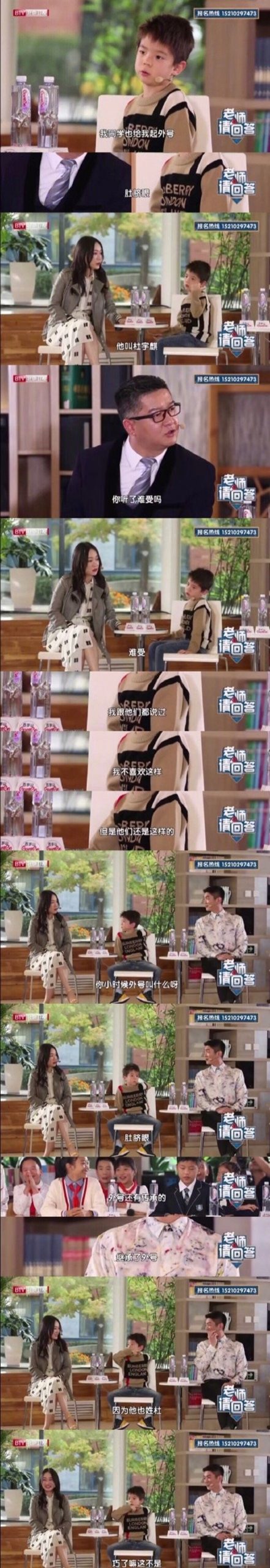 另外,嗯哼也分享了他在學校的故事,嗯哼說同學給他取了「肚臍眼」的外號(嗯哼本名叫杜宇麒),嗯哼直言聽了很難受,杜江和霍思燕也是第一次聽說這件事。霍思燕接著問杜江小時候的外號是什麼,杜江回說:「肚臍眼。」主持人笑說:「外號也有傳承的?」嗯哼接話說:「因為他也姓杜啊!」杜江無奈的看著嗯哼說:「我肯定姓杜啊!巧了啊這是~」哈哈哈哈,父子倆太有梗了!