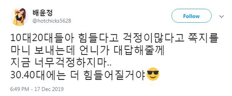 最近裴允靜在推特的發文,在韓網成為話題,她17日在推特寫道:「常常收到10代、20代朋友的私訊,説自己很累、煩惱很多,姊姊我來為你們解答,現在不需要太擔心,30、40代的時候會更累的。」