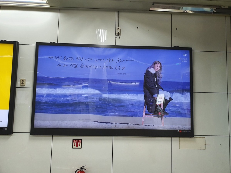 第二彈驚喜則是在光化門地鐵站內購下生日逆應援廣告燈牌,感謝粉絲們多年來的支持!在燈牌上寫著「因我視線所到之處有你存在,所以我今天也能笑著。12.22謝謝你們祝我生日快樂,MooMoo」的句子,是玟星想對MooMoo所說的話喲~