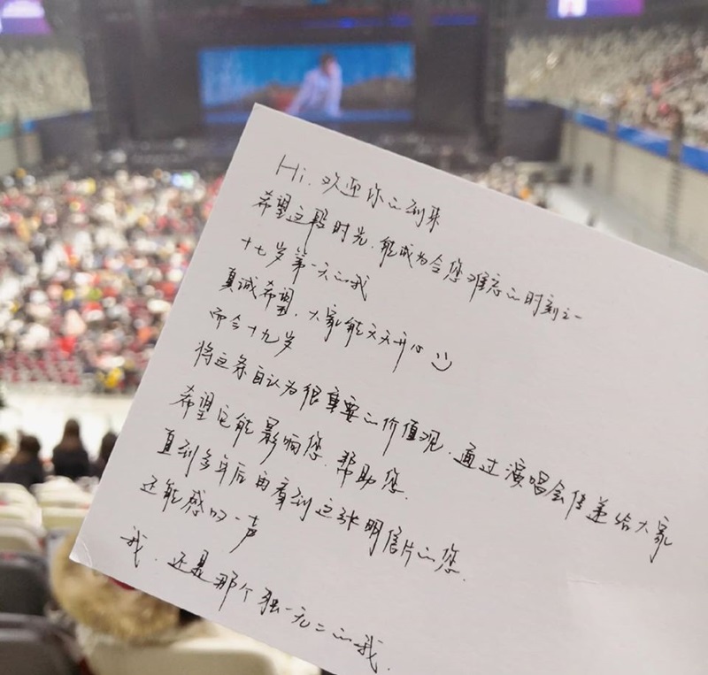 最最最讓粉絲驚喜的是,易烊千璽還給粉絲寫了手寫信呢!卡片上寫道:「Hi,歡迎你的到來,希望這段時光,能成為令您難忘的時刻之一,十七歲第一天的我,真誠希望,大家能天天開心,而今19歲,將這條自認為很重要的價值觀,通過演唱會傳遞給大家,希望它能影響您,幫助您;直到多年後再看到這張明信片的您,還能感歎一聲,我,還是那個獨一無二的我。」