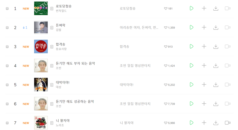 或許是被論壇的話影響了,每年網友會分享新年第一天聽的歌曲,而2020年的歌單是什麼呢?進入新年整點,Melon音源網站的5分曲線榜竟出現三首歌曲,接著在急上升榜也看到很多「好意頭」的歌曲上榜喲~五分線榜內前三首歌包括了宇宙少女《As You Wish》、Kim Pil的《意外之財 》和NORAZO趙彬的《聽了就會成功的音樂》。