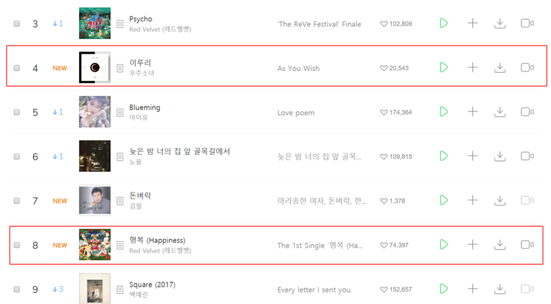 不只是在急上升榜,凌晨時分的Melon實時榜也相當精彩啊!尤其是宇宙少女的《As You Wish》和Red Velvet《Happiness》都成功擠入前10名,讓粉絲們又驚又喜!