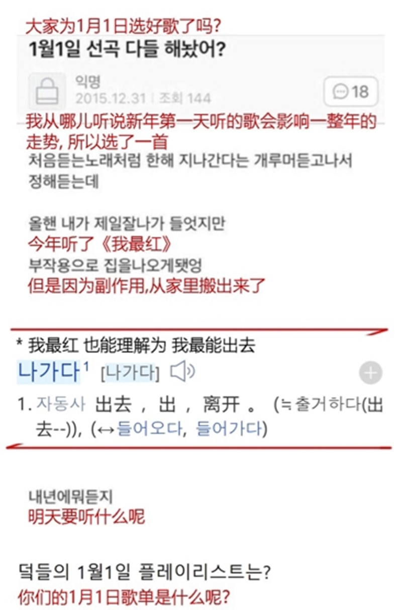 2015年的TheQoo論壇中,一名網友曾表示聽過在新年第一天聽的歌曲會影響一整年的走勢,在當年聽了2NE1的「내가 제일 잘 나가(I’m The Best)」,結果副作用般從家裡搬出來了!所以啊,聽歌需要找點比較直接的,沒有其他「含義」的歌名來聽,這樣就能保證自己的運氣會一直旺下去!