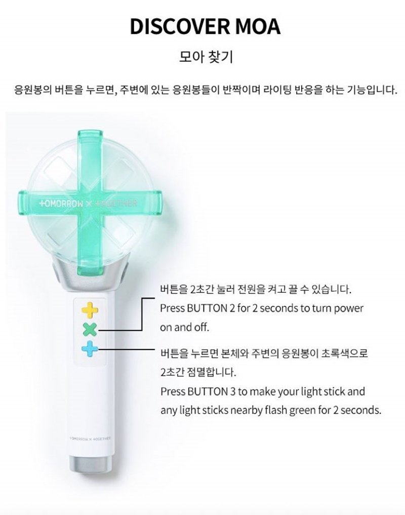 除了手燈顏色,它的特殊功能也引起了熱議。據悉,TXT手燈有中控功能之餘,還包括了Together Mode和Discover MOA哦!不過,部分網民對Discover MOA功能相當奇怪。只要按下藍色按鈕,附近的TXT手燈就會亮起兩秒!
