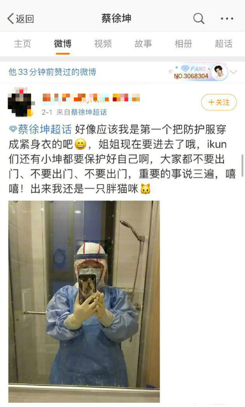 該粉絲於近日曬出一張身穿防護衣的自拍,並堅定發文稱:“好像應該我是第一個把防護服穿成緊身衣的吧,姐姐現在要進去了哦,ikun們還有小坤都要保護好自己啊,大家都不要出門、不要出門、不要出門,重要的事說三遍,嘻嘻!出來我還是一只胖貓咪”。隨後,蔡徐坤也為這條微博點贊了!希望來自愛豆的鼓勵可以轉化為動力,傳遞給這位粉絲哦!