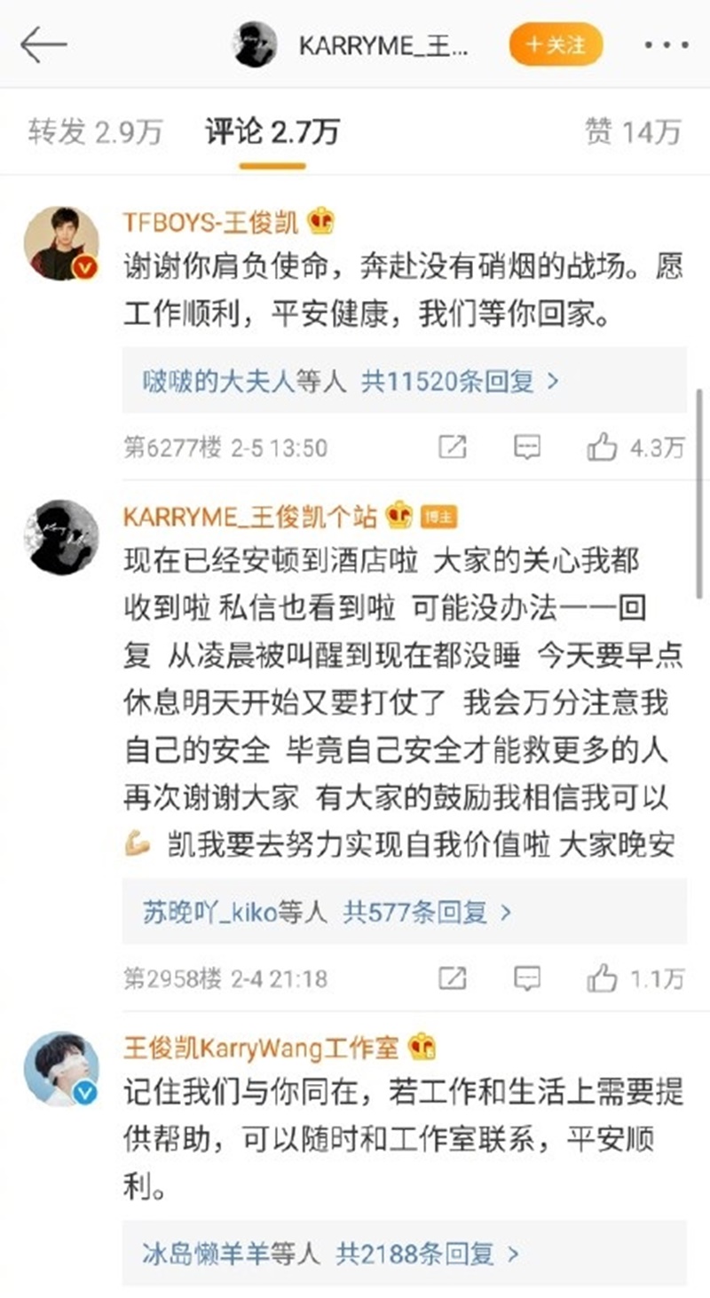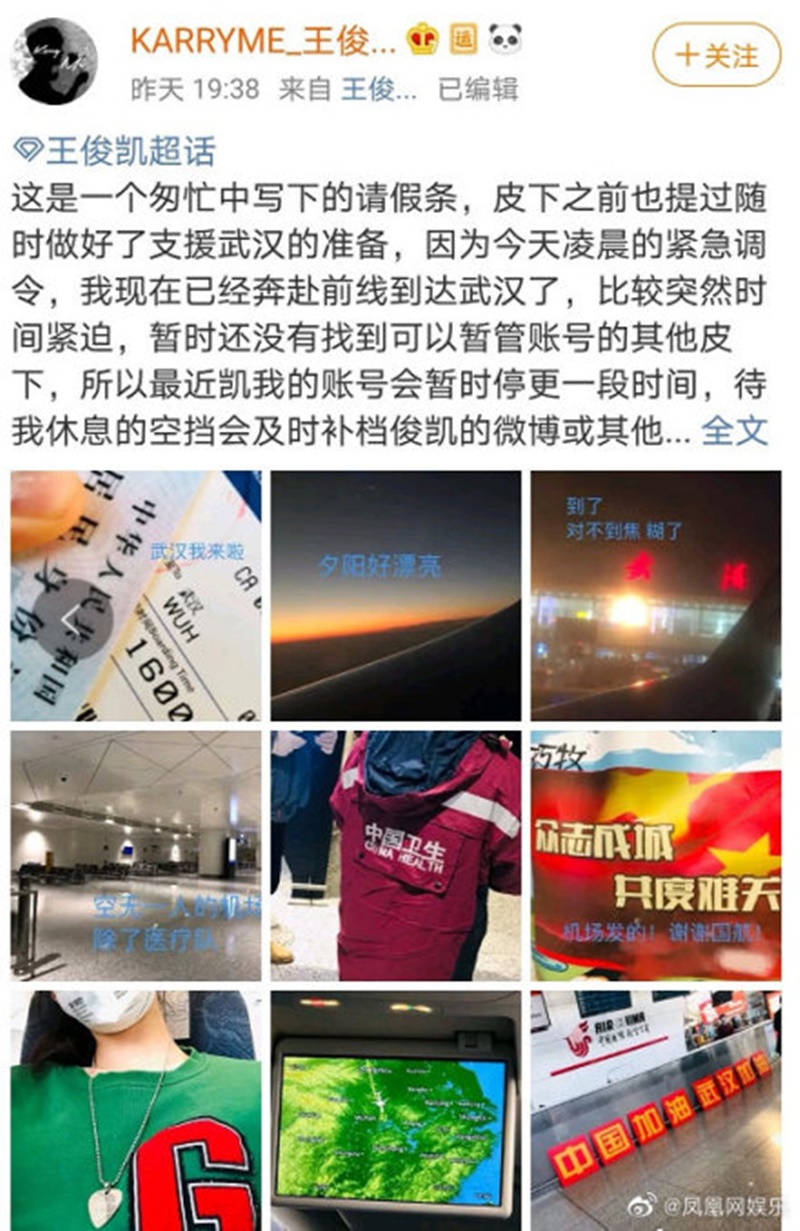 中國各地新型冠狀病毒(武漢肺炎)確診個案不斷上升,許多中國人都加入有錢出錢,有力出力的行列,希望能出上一份力。日前有位負責管理「KARRYME_王俊凯个站」的王俊凱粉絲在微博發文,表示被指派到武漢進行醫療支援,因此需要暫停更新各站。