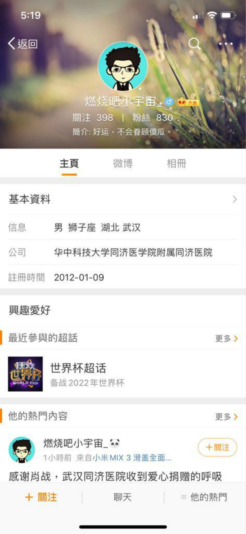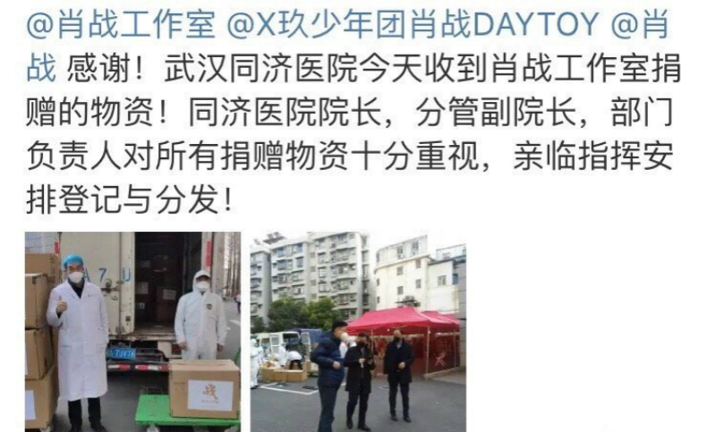 武漢同濟醫院在收到愛心捐贈的呼吸器後,留言感謝肖戰。