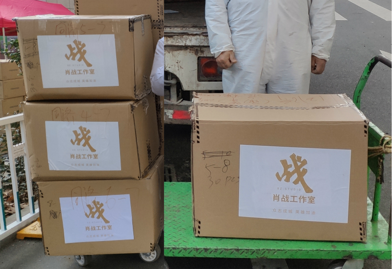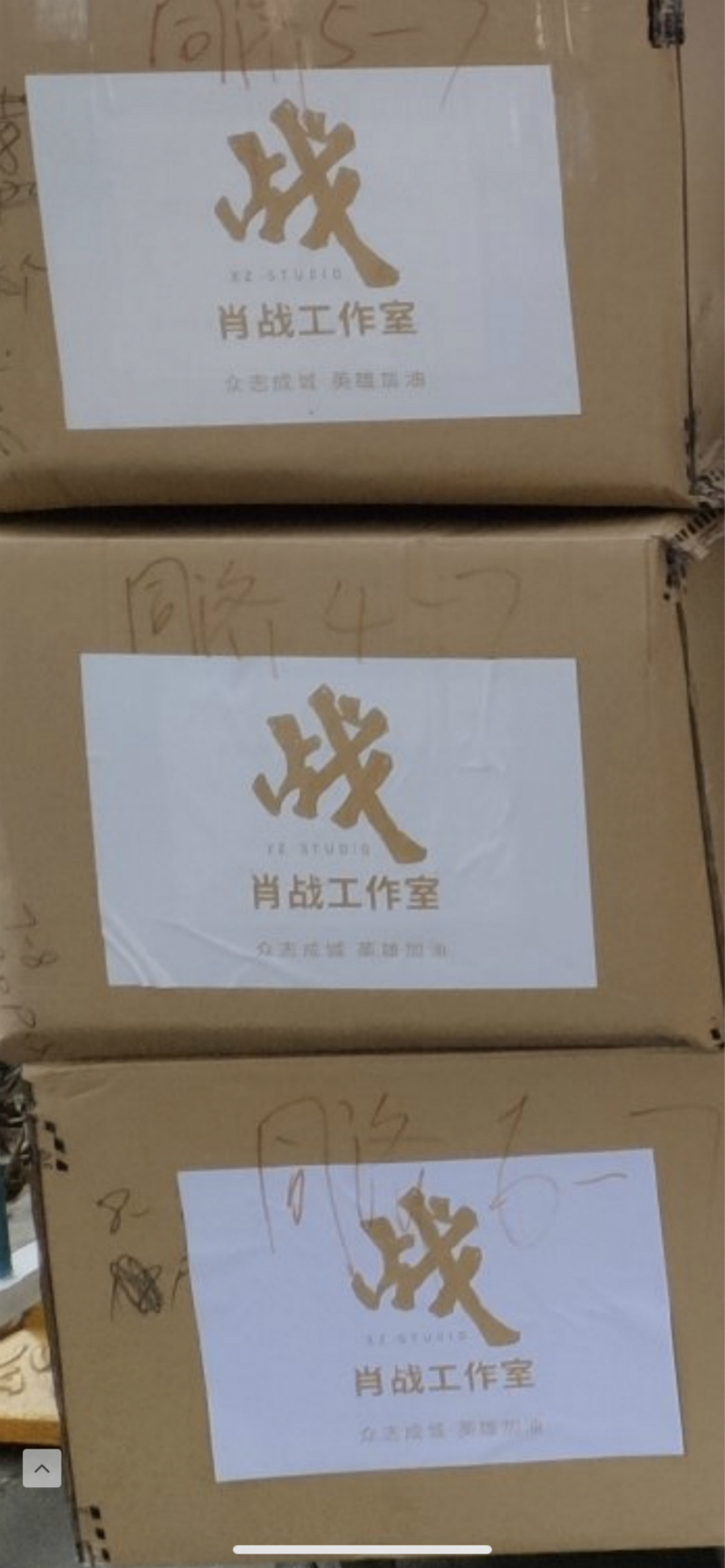 物資盒子外可以看到肖戰工作室的“戰”字Logo。