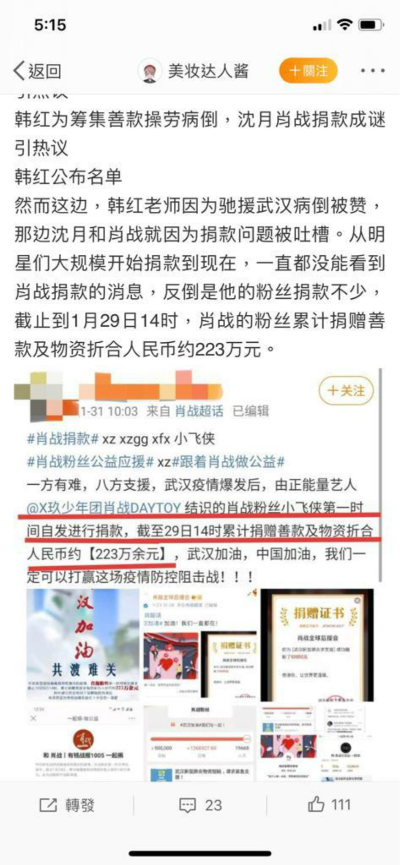 小飛俠(肖戰粉絲)其實也在第一時間自發進行捐款,截止1月29日14時,就累積捐贈善款及物資折合人民幣約【235萬餘元】。