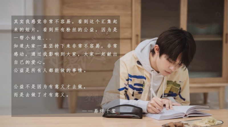 「公益不是因為這件事有意義你才去做,而是你做了這件事才有意義」,這是易烊千璽說過的話,正能量偶像以身作則帶動更多粉絲做公益,為他點讚。