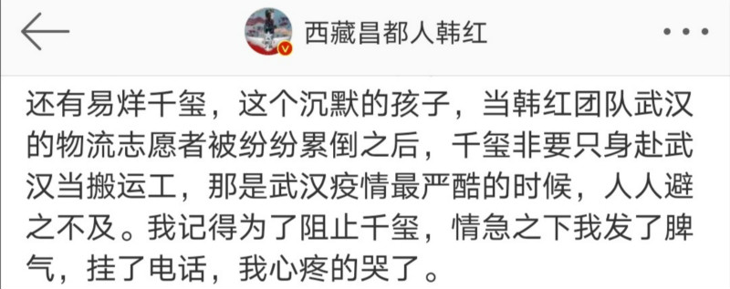當中,韓紅特別點名了身為第一批捐贈人之一的易烊千璽,原來四字弟弟在物流志願者被紛紛累倒之後,曾要求隻身親上前線,到武漢當搬運工,但卻被韓紅拒絕了!韓紅原文如下:「這個沉默的孩子,當韓紅團隊武漢的物流志願者被紛紛累倒之後,千璽非要隻身赴武漢當搬運工,那是武漢疫情最嚴酷的時候,人人避之不及。我記得為了阻止千璽,情急之下我發了脾氣,掛了電話,我心疼的哭了。」