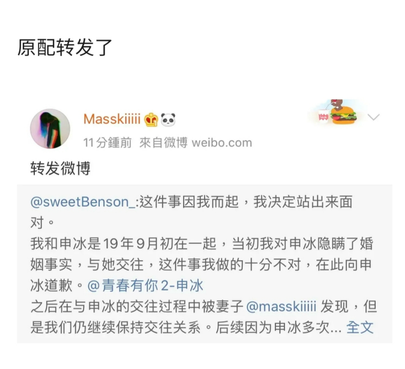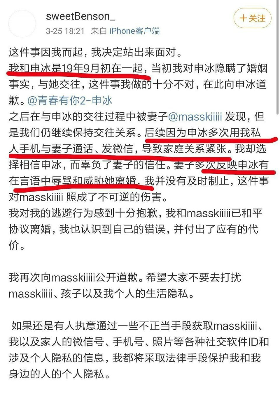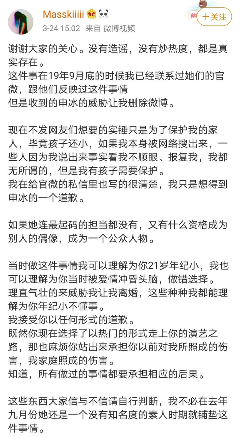 在文裡面男主角表示自己在19年9月初的時候,就和申冰在一起,不過是在隱瞞了婚姻事實的情況下和她交往。還表示自己做錯了,要向申冰道歉。(男主還艾特了申冰的微博號)接著他表示在於申冰交往的過程中,被妻子發現,後來申冰多次使用自己的手機和妻子通話和發微信,導致家庭關係緊張。男主還表示妻子多次反映申冰有在語言中辱罵和威脅她離婚,但自己並沒有制止,男主角也強調發文的主要目的是要向妻子道歉。男主角發的文,過後也被妻子轉發。