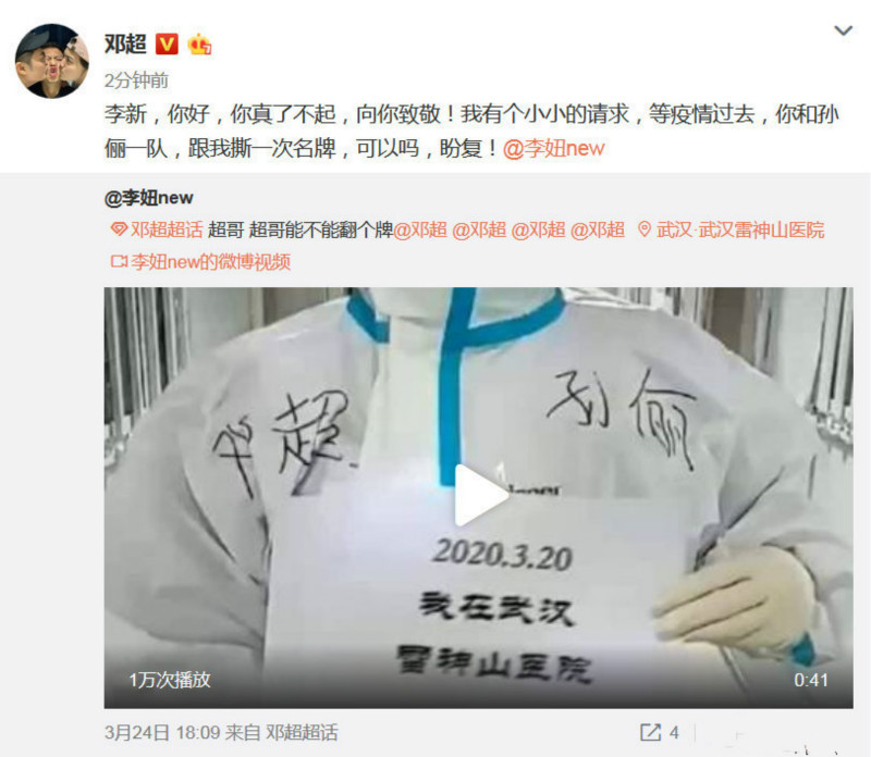 暖心的鄧超轉發了該名粉絲的微博,回復,“李新,你好,你真了不起!向你致敬!我有個小小的請求,等疫情過去,你和孫儷一隊伍 ,跟我撕一次名牌,可以嗎,盼復!”