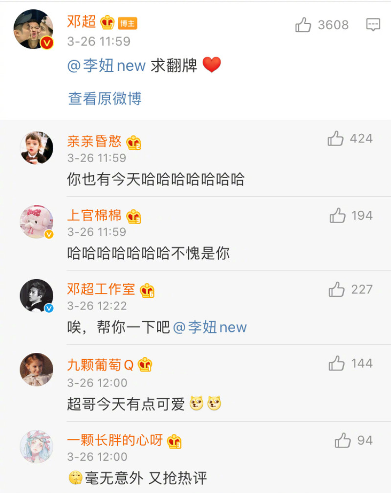 可愛的是,鄧超還特地標記李妞說:求翻牌❤,讓網友們都忍不住說超哥也有今天!就連鄧超工作室的微博號都說,“唉,幫你一下吧”並標記了李妞。