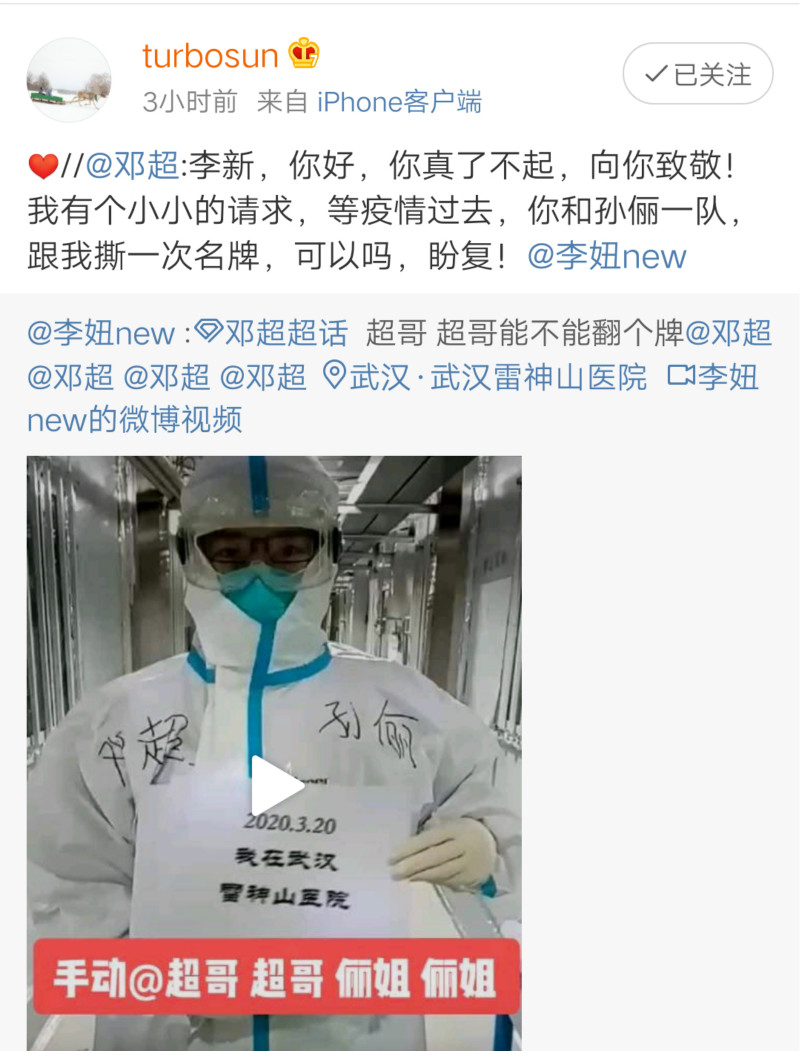 24日,一名支援武漢的醫護人員-李妞,在網上分享了表白鄧超和孫儷夫婦的視頻,“喜歡你們好多年,希望疫情結束,可以見到你們。”這條視頻在網上掀起了不少的轉發,也包括了鄧超本人!