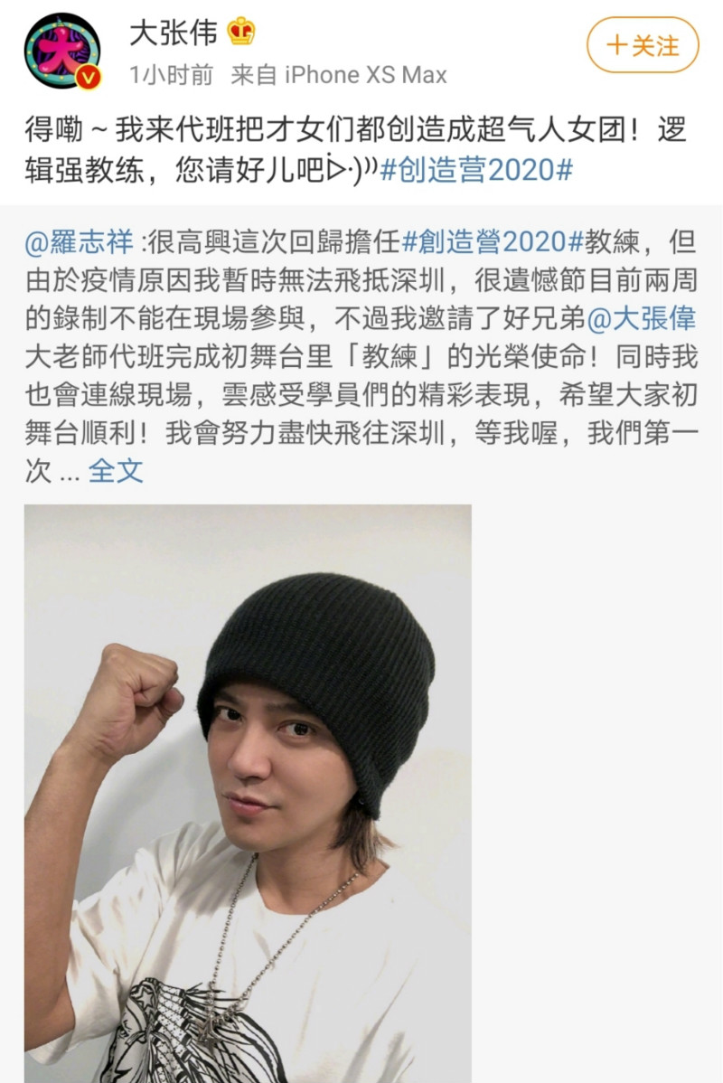 自《創造營2020》的教練團,確定由黃子韜、鹿晗、羅志祥、毛不易和宋茜組成後,教練團們也已經飛往深圳,開始了節目的錄製!同樣身為教練團其中一員的羅志祥,卻因為疫情原因而無法飛往錄製節目。所以前兩週的錄製,將會由好兄弟大張偉代班。羅志祥也表示會連線現場,雲感受學員們的精彩表現!大張偉也特地轉發了羅志祥的微博,留言依舊滿滿的是“大張偉老師獨有的說話語氣”啊!“得嘞~我來代辦吧才女們都創造成超氣人女團!邏輯強教練,您請好兒吧!”搞笑滿分!!