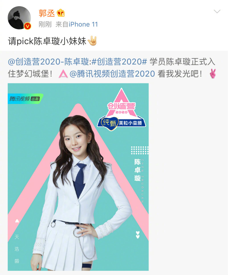 飾演藍景儀的郭丞也發文表示:“請Pick陳卓璇小妹妹”。