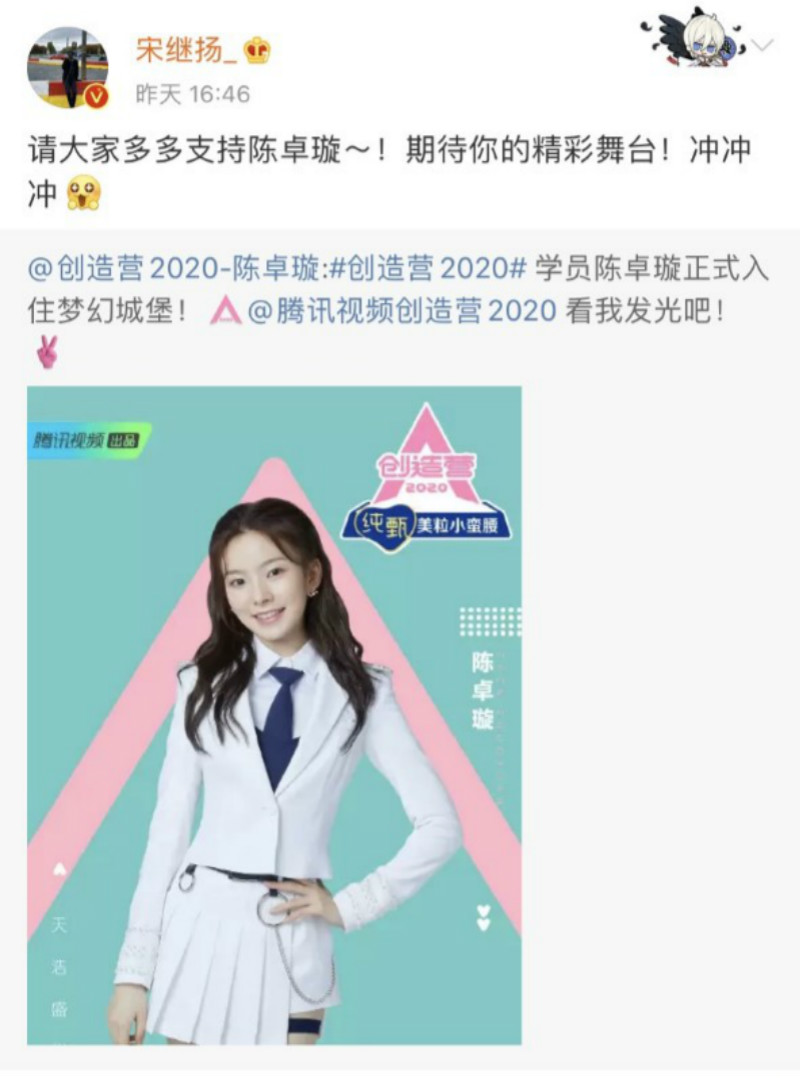 和陳卓璇在戲中最有互動的“曉星塵” 宋繼揚,發文:“請大家多多支持陳卓璇~!期待你的精彩舞台!衝衝衝!”