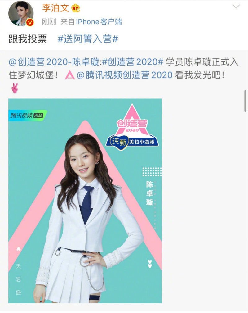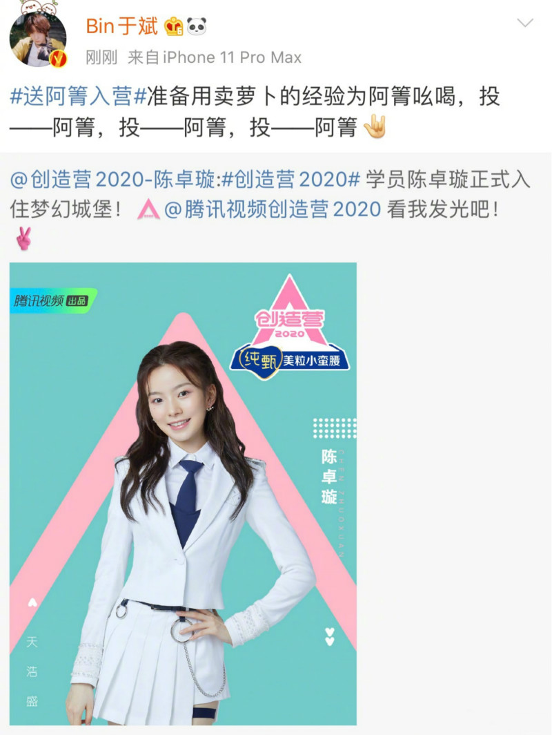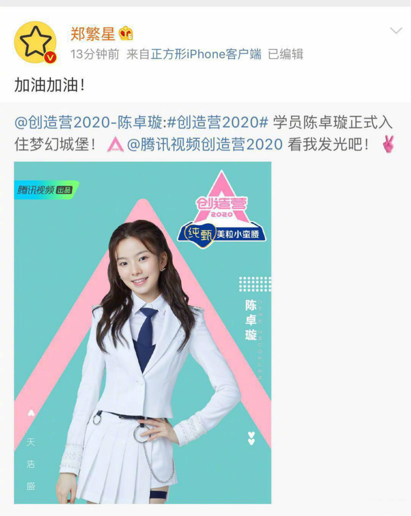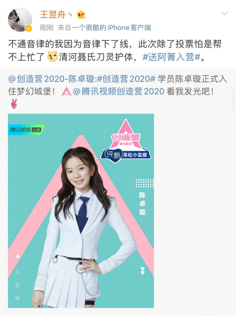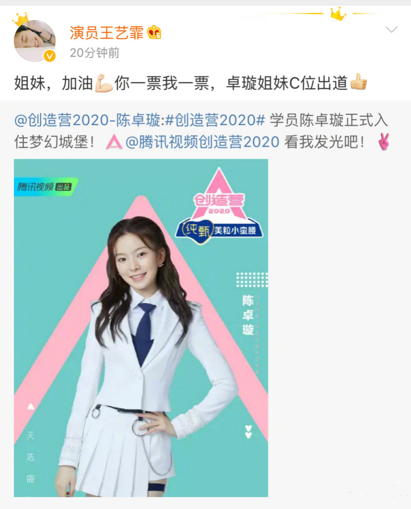 和陳卓璇感情很好的“綿綿”王藝霏也發文:“姐妹,加油!你一票我一票,卓璇姐妹C位出道!”