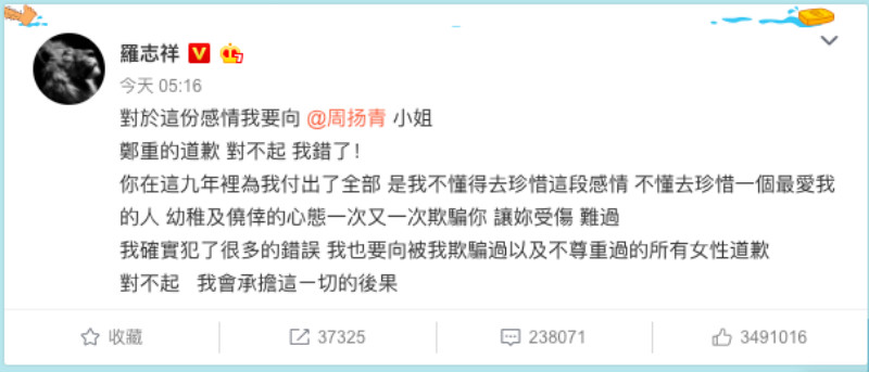 凌晨五點~羅志祥再度向周揚青道歉! 羅志祥再度向周揚青道歉! 星聞 By 歐巴是我的 Last updated Apr 24, 2020 Share 24號凌晨5點,羅志祥在微博再度向前女友周揚青道歉。 全文如下: 「對於這份感情我要向 @周扬青 小姐 鄭重的道歉 對不起 我錯了! 你在這九年裡為我付出了全部 是我不懂得去珍惜這段感情 不懂去珍惜一個最愛我的人 幼稚及僥倖的心態一次又一次欺騙你 讓妳受傷 難過 我確實犯了很多的錯誤 我也要向被我欺騙過以及不尊重過的所有女性道歉 對不起 我會承擔這ㄧ切的後果」 網友打趣的說,相比起周揚青在早上9點發博,羅志祥果然是不需要睡覺的啊! 周揚青羅志祥 Share