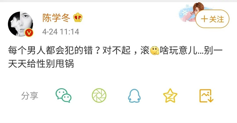 這言論讓陳學冬也忍不住Diss回!直接在微博公開喊話表示:「每個男人都會犯的錯?對不起,滾!啥玩意兒…別一天天給性別甩鍋」