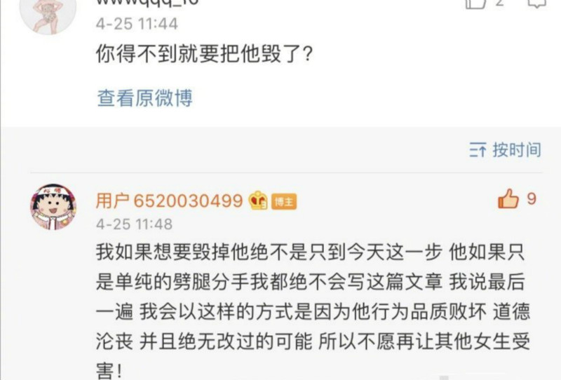 有粉絲問周揚青:「你等不到就要把他毀了?」周揚青回復:「我如果想要毀掉他,絕不是只做到今天這一步,他如果只是單純的劈腿分手,我都不會寫這篇文章,我說最後一遍,我會以這樣的方式,是因為他行為品質敗壞道德淪喪,並且絕無改過的可能,所以不願再讓其他女生受害!」