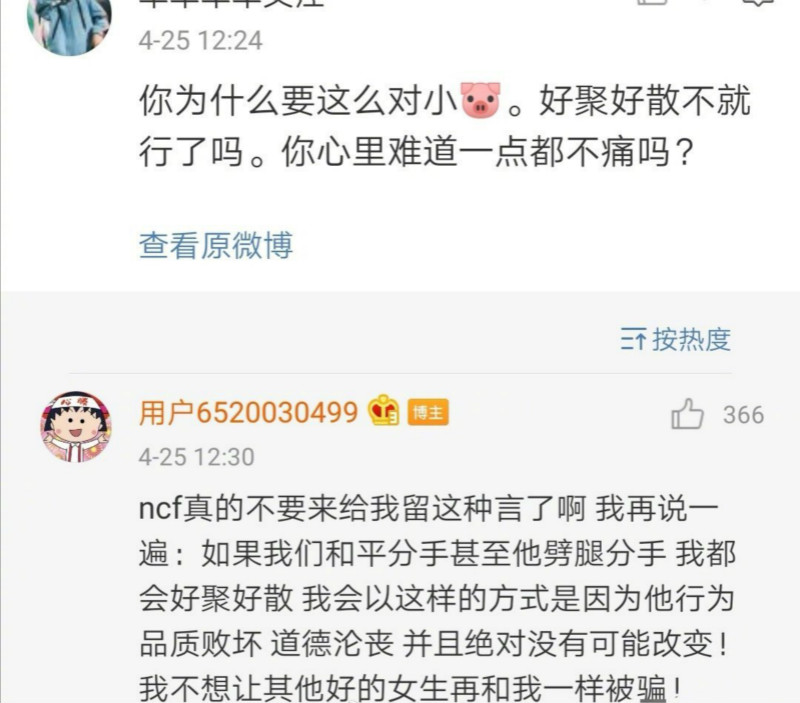 還有粉絲在周揚青小號提問:「你為什麼要這麼對小豬?好聚好散不就行了嗎。你心理難道一點都不痛嗎。」周揚青回復:「ncf(腦殘飯)真的不要來給我留這種言論了啊!我再說一遍:如果我和平分手甚至他劈腿分手,我都會好聚好散,我會以這樣的方式是因為他行為品質敗壞,道德淪喪,並且絕對沒有可能改變!我不想讓其他號的女生再和我一樣被騙!」