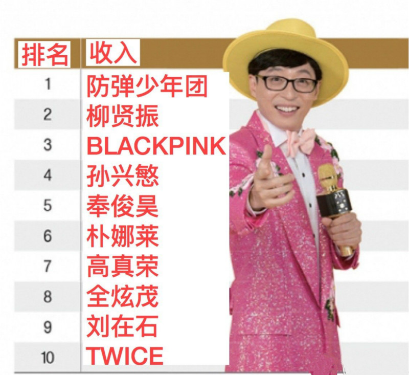 大家最關注的收入排行榜來啦!不用懷疑,世界彈BTS就是收入總冠軍!而藝人方面,Blackpink則是隨著BTS之後排在第三~值得一提的是,國民MC劉在石排在第九,TWICE則入榜排名第十喲!