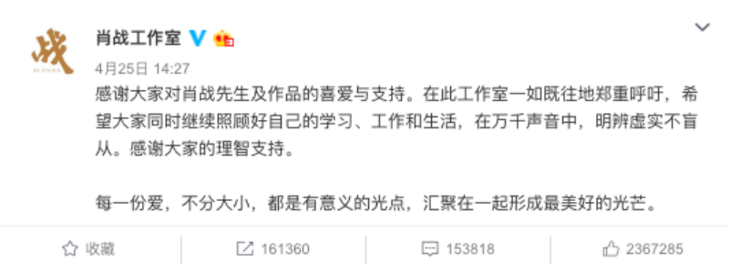 值得一提的是,由於《光點》上線僅僅一天的時間總銷量就突破了2500萬,銷售額更是衝過7400萬大關,肖戰工作室還發文:「感謝大家對肖戰先生及作品的喜愛與支持。在此工作室一如既往地鄭重呼籲,希望大家同時繼續照顧好自己的學習、工作和生活,在萬千聲音中,明辨虛實不盲從。感謝大家的理智支持。」