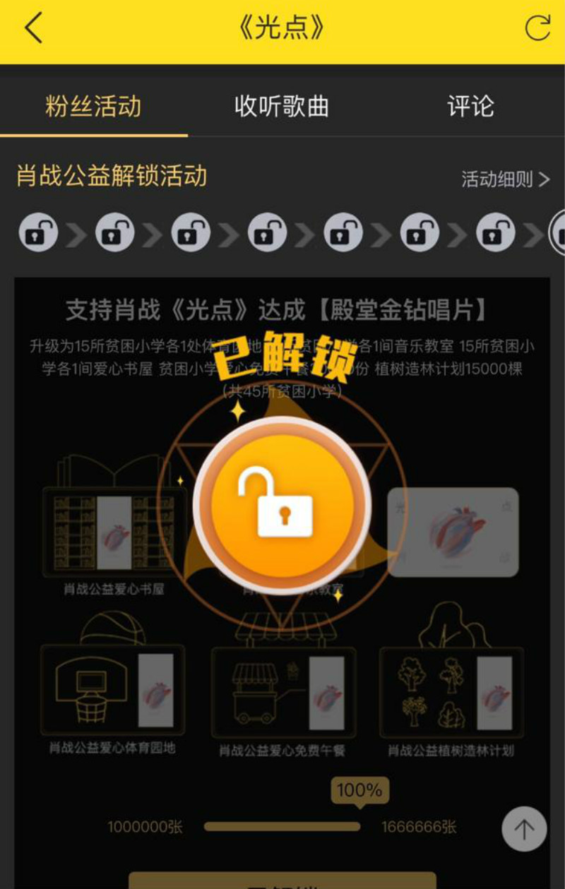 另外必須提的是,在其中兩個音樂平台:酷狗和酷我購買《光點》單曲,還能支持公益,至今已經成功向15所貧困小學增添體育園地、15所貧困小學增添音樂教室和15所貧困小學增添愛心書屋。另外也提供了3萬分貧困小學愛心午餐,以及植樹造林計劃15000棵。支持音樂,還能做公益,這個真的很有意義。
