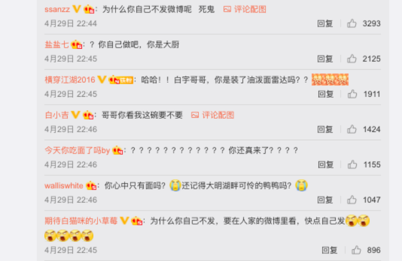更有粉絲表示;「為什麼你自己不發微博呢?」、「白宇哥哥,你是裝了油潑麵雷達嗎?」、「為什麼你自己不發,要在人家的微博裡看,快點自己發!」