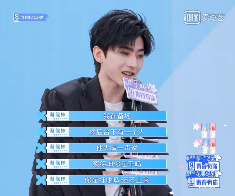 他也分享有一次海外公演,在準備的時候,有一個人很大聲的說:「蔡徐坤你在幹嘛,你在打球嗎?還不上來!」後來他在表演的過程中,他即興加了一句話:「愛我的恨我的,我謝謝所有,i wanna thank you all。」他說當時他說這句話的時候,其實自己很不開心,挺難過的。