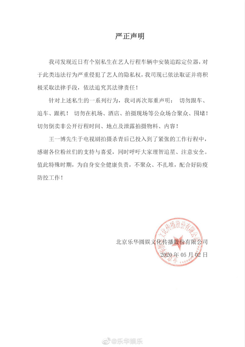 在聲明中,樂華娛樂斥責私生在藝人行程車輛中安裝追蹤定位器,表示此類違法行爲嚴重侵犯了藝人的隱私權,現已依法取證並將積極採取法律手段,依法追究其法律責任。同時稱王一博在電視劇拍攝殺青後,已投入到了緊張的工作行程中:「呼籲大家理智追星、注意安全,爲自身安全健康負責,不聚衆、不扎堆,配合好防疫防控工作!」