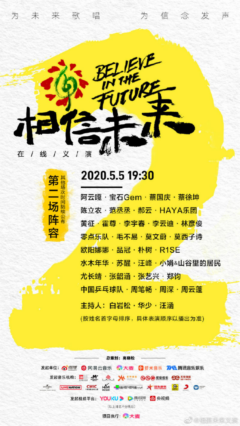 超過100組藝人支持參與的《相信未來義演》,終於宣佈了更多詳情!首先官宣了目前有兩個場次,分別是5月4日和5月5日,晚上7.30半在線匯聚表演,先來看看首場陣容有誰吧!