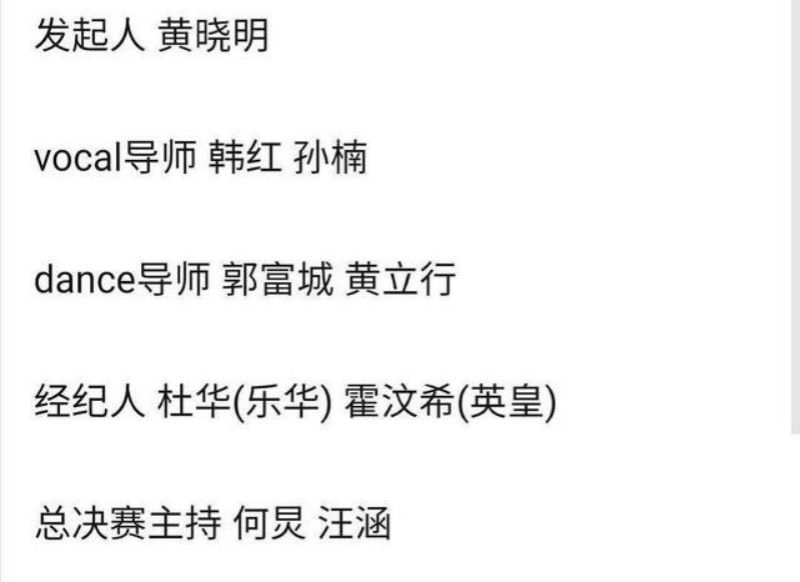 網上也表示,黃曉明將會擔任發起人,Vocal導師是韓紅和孫楠、Dance導師是郭富城和黃立行、經紀人則是杜華(樂華)和霍汶希(英皇),總決賽主持還是何炅和汪涵!