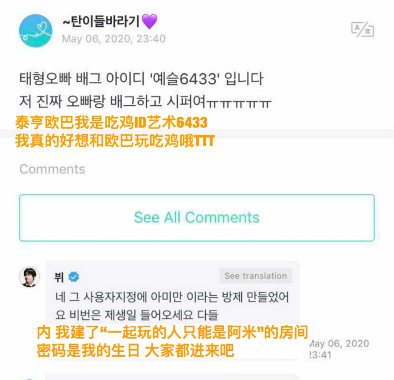 隨後,就有阿米表示想和他玩吃雞遊戲!沒想到金泰亨表示他真的建了“一起玩的人只能是阿米”的房間呢!還表示密碼是他的生日!!邀請大家一起玩啊~~~
