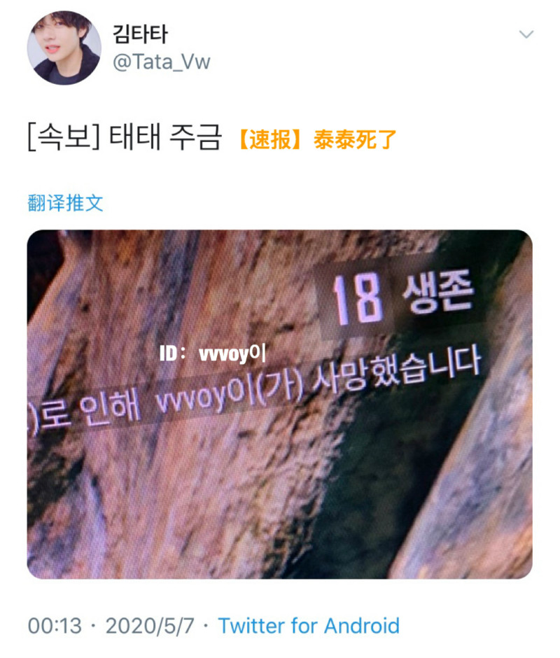 結果騎著摩托到處走的金泰亨,在凌晨00:13分時在推特上發了“「速報」泰泰死了”的推文!!