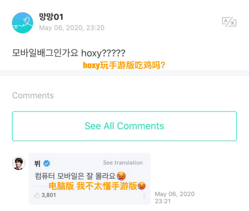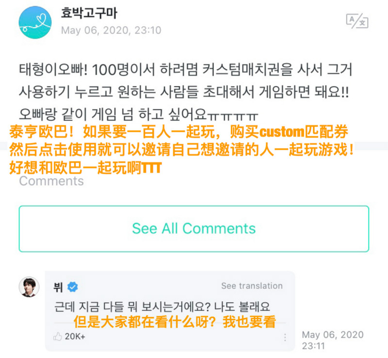 隨後,就有阿米表示想和他玩吃雞遊戲!沒想到金泰亨表示他真的建了“一起玩的人只能是阿米”的房間呢!還表示密碼是他的生日!!邀請大家一起玩啊~~~
