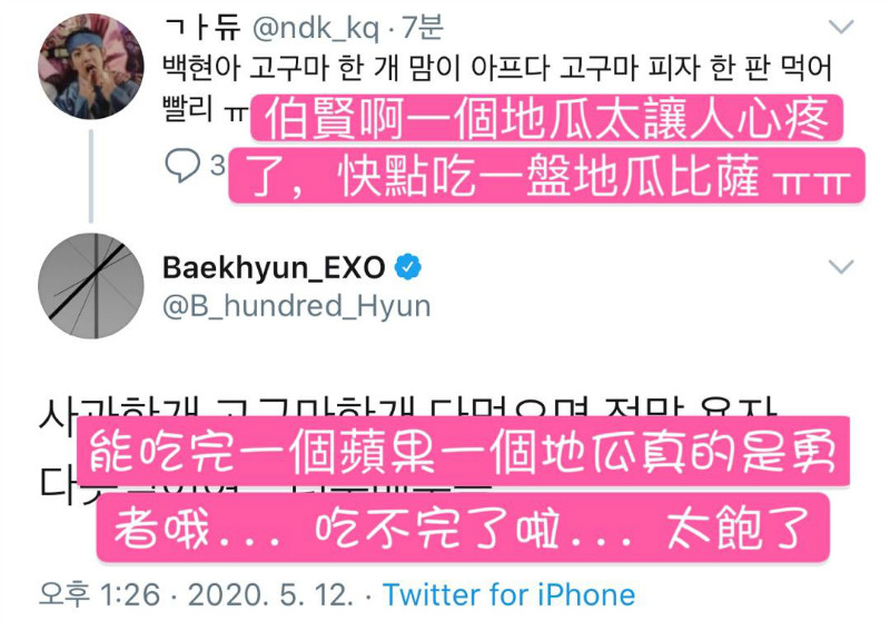 有愛麗就留言表示:「伯賢啊⋯⋯一個地瓜太讓人心疼了,快點吃一盤地瓜比薩。」沒想到伯賢居然回覆表示:「能吃完一個蘋果一個地瓜真的是勇者哦… 吃不完了啦… 太飽了。」