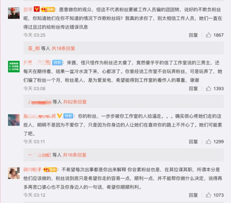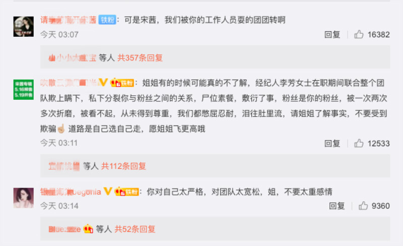但在評論區裡,不少粉絲也留言請宋茜不要“下場”,並明確表達他們的立場,也請宋茜不要再繼續“被矇騙”。「可是宋茜,我們被你的工作人員耍的團團轉啊!」、「粉絲是你的粉絲,被一次兩次多次折磨,被看不起,從未得到尊重,我們都憋屈忍耐,淚往肚裏流,請姐姐瞭解事實,不要受到欺騙…」「你對自己太嚴格,對團隊太寬鬆,姐,不要太重感情…」