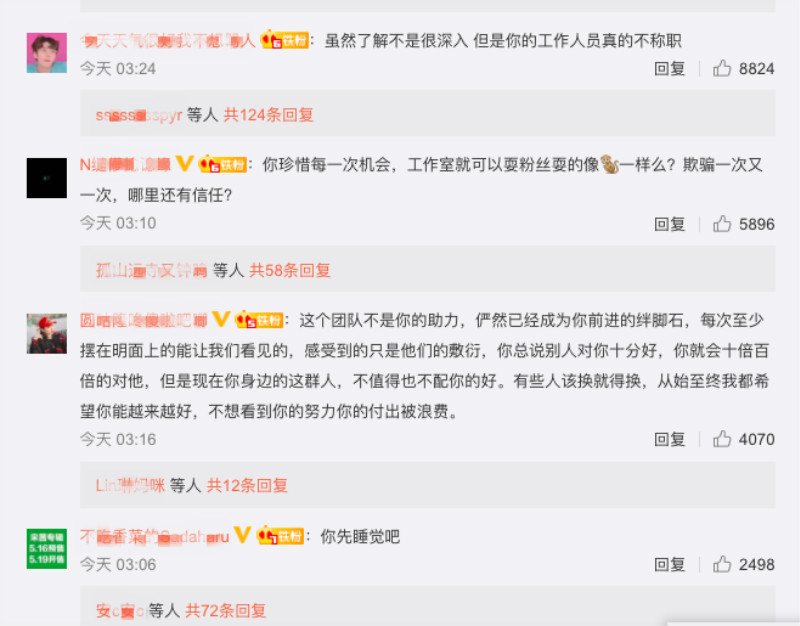 「你珍惜每一次機會,工作室就可以耍粉絲耍的像🐒一樣麼?欺騙一次又一次,哪裏還有信任?」「這個團隊不是你的助力,儼然已經成爲你前進的絆腳石,每次至少擺在明面上的能讓我們看見的,感受到的只是他們的敷衍,你總說別人對你十分好,你就會十倍百倍的對他,但是現在你身邊的這羣人,不值得也不配你的好。有些人該換就得換,從始至終我都希望你能越來越好,不想看到你的努力你的付出被浪費。」